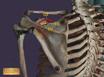 ![]() | Posterior view of the scapula showing the superior scapular notch bridged by superior transverse ligament (1). The suprascapular artery (2) passes over the ligament and the suprascapular nerve (3) passes deep to the ligament. Both artery and nerve continue around the notch of the spine into the infraspinatous fossa where they supply the muscles there. |