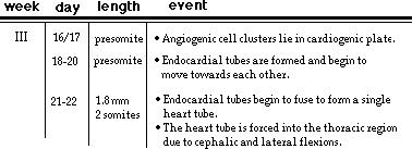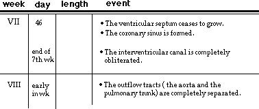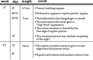 The heart tube begins to grow rapidly forcing it to bend upon itself. The result is the bulboventricular loop. Septa begin to grow in the atria, ventricle and bulbus cordis to form right and left atria, right and left ventricles and two great vessels- the pulmonary artery and the aorta. By the end of the eighth week partitioning is completed and the fetal heart has formed. You may wish to view the timetable of events for Week 3, Week 4, Weeks 5-6, and Weeks 7-8 and keep these images open while you proceed through the lesson.