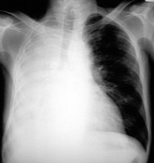 Resorptive atelectasis When airways are obstructed there is no further ventilation to the lungs and beyond. In the early stages blood flow continues and gradually the oxygen and Nitrogen get absorbed, resulting in atelectasis. The following in an example of right lung resorptive atelectasis. In this instance, atelectasis followed bronchial obstruction due to cancer. Lung is not permitted to assume complete atelectatic state as occusr in pneumothorax as it is held by the negative pressure in pleura. Some amount of fluid exudes into alveoli, and thus it is not completely empty. |
