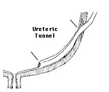 The mesonephric (Wolfian) duct descends from the mesonephros to meet the urogenital sinus. Once this connection is made, fetal urine drains into the urogenital sinus. The ureteric bud arises from the mesonephric duct and progresses laterally to invade the metanephrogenic blastema (precursor of the mature kidney). The caudal end of the mesonephric duct (past the ureteric bud is called the common excretory duct. As renal development proceeds, the common excretory duct is incorporated into the urogenital sinus. Progressive incorporation of the common excretory duct eventually leads to separate openings of the ureter and mesonephric duct into the urogenital sinus. By 37 days of gestation, the ureter empties into the urogenital sinus cephalad to the mesonephric duct. The urogenital sinus is divided between the orifices of these two tubes. The cephalad portion of the urogential sinus will become the bladder while the caudal portion will become the urethra.