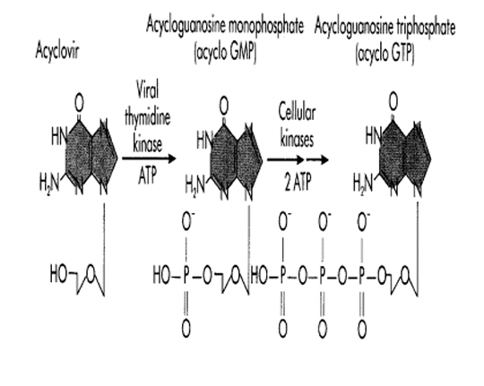 ACV has selective action against those herpesviruses that encode a Thymidine Kinase (TK). The viral Thymidine Kinase activated the drug by phosphorylation, and host cell enzymes complete the process to the triphosphate form.