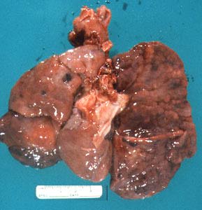 | Red, consolidated and hypocrepitant lungs in hyaline membrane disease (HMD) (gross picture). |
