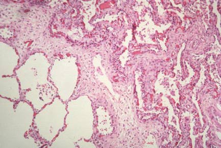 Low power of lung with BPD; severe fibrosis at upper left, compensatory emphysema of less damaged area at bottom right.