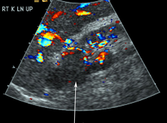 Renal pelvis is filled with urine and is echo free. Note the posterior enhancement behind renal pelvis. |