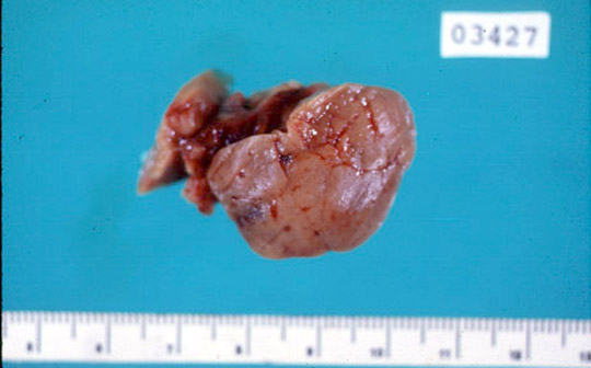 - Parathyroid adenoma: the surgical specimen consists of a cut section of parathyroid gland. The normal gland is replaced by a well defined, brown neoplasm. Normal parathyroid glands generally do not exceed 0.5 cm in greatest dimension.