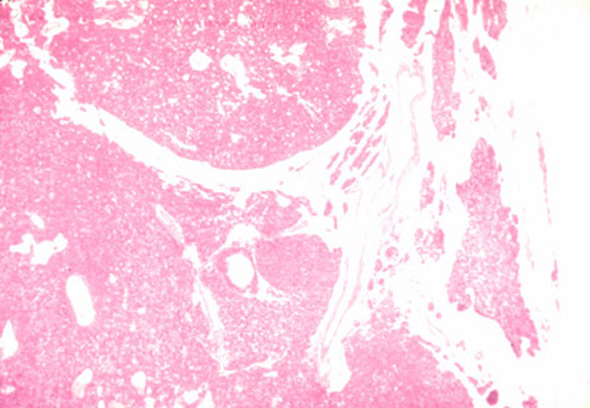 a microscopic section of the parathyroid gland reveals an adenoma. The neoplasm is composed of sheets of uniform cells displacing adipose cells. The expanding neoplasm compresses adjacent normal parathyroid tissue.