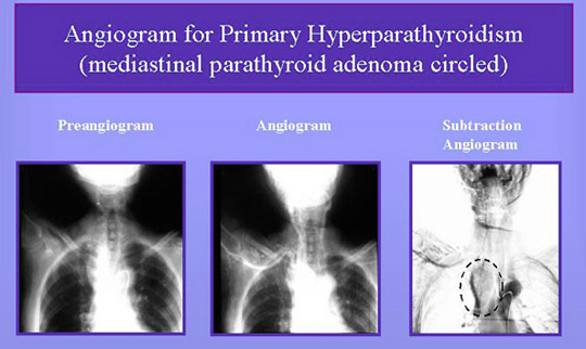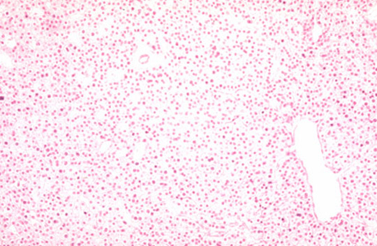 - Parathyroid adenoma: a microscopic section reveals an adenoma. The neoplasm is composed of a sheet of uniform cells. Each cell contains pink cytoplasm and a round dark nucleus. Note the absence of adipose cells.