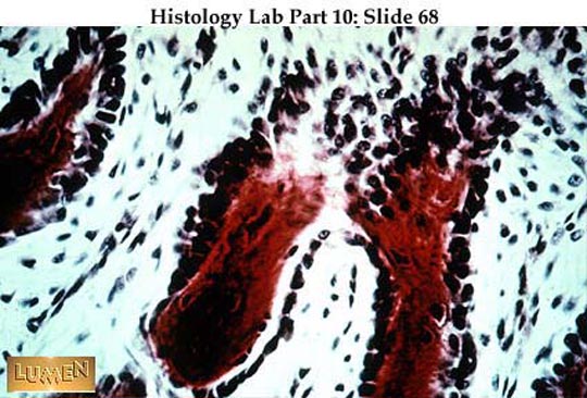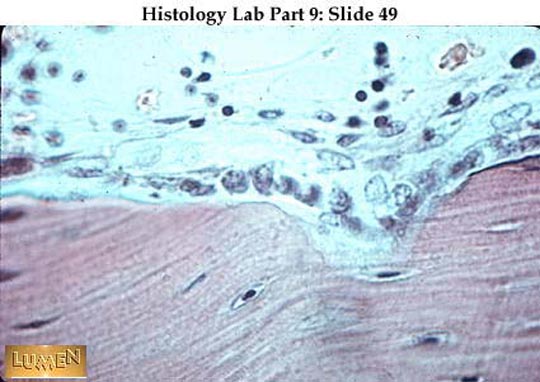 - Detail of bone-forming osteoblasts lined up along the inner edge of bone next to the marrow cavity.