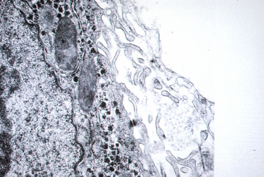Fig 18 - A space that can be visualized only by electron microscopy between endothelial sinusoidal wall and hepatocyte.Numerous villi of hepatocytes float in this space obviously to increase their absorptive capacity. Only plasma filtrated by the endothelium flows in it. No blood cells. It contains different types of collagen,mainly type I and IV with proteoglycans an fibronectin.