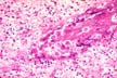 Among various amebas, the Entamoeba histolytica is the one that invades tissues in man. As long as it remains in the lumen of the colon (luminal phase), it causes no problems. When it invades the bowel wall (invasive phase) it causes a diarrhoic syndrome and may spread to the liver where it forms amebic abscesses which are usually solitary. The patient experiences pain and tenderness in that region and general symptoms with fever. The diagnosis of abscess is made with imaging techniques. The diagnosis of amebiasis is made by serological tests for amebic antibodies. The treatment is by drugs and rarely surgical. The first association of ameba with liver abscess was described by Loesch in St. Petersburg, Russia, in 1875.The figure shows clusters of ameba trophozoites in the tissue, large, up to 60 microns in diameter. This is the active mobile form. They have one small eccentric nucleus and cytoplasmic vacuoles sometimes containing red cells. The cystic form with round shape and multiple nuclei does not occur in the tissues.