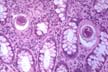 | Fig.149-Schistosoma mansoni Eggs in the venules of the intestinal mucosa which are shed into the intestinal lumen and the environment where they release their miracidia which go to parasitize the snails. The eggs are about 150 microns in maximum diameter. The lateral spine cannot be seen in this section. | |