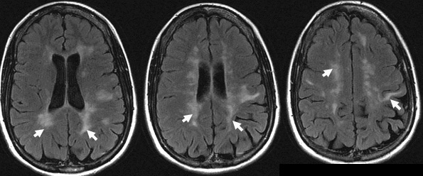Nonenhanced brain MRI (FLAIR) images show asymmetrical, abnormal high signal white matter lesions in the periventricular and subcortical areas