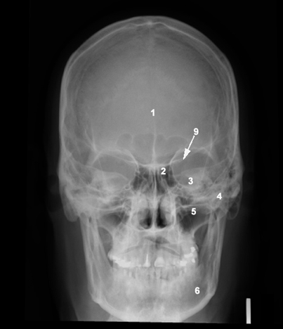 1: Frontal bone 2: Nasal bone 3: Inferior orbital fissure 4: Zygomatic 5: Maxilla
