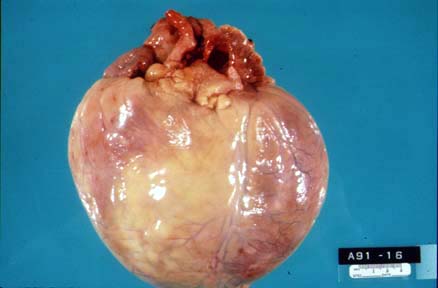 This photograph depicts a large, globular heart of dilated cardiomyopathy.