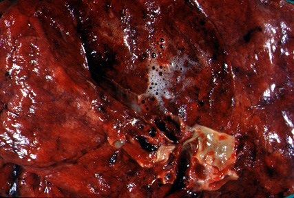 The frothy liquid oozing from the cut surface of the lung is caused by air moving through water in the respiratory tree.