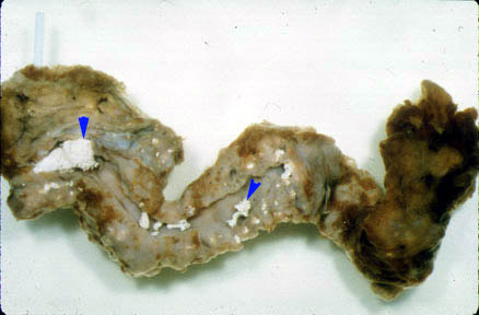 Pathology Chronic pancreatitis:The pancreas is shrunken and fibrotic. The main duct is dilated and filled with calcified secretions (small arrows). |