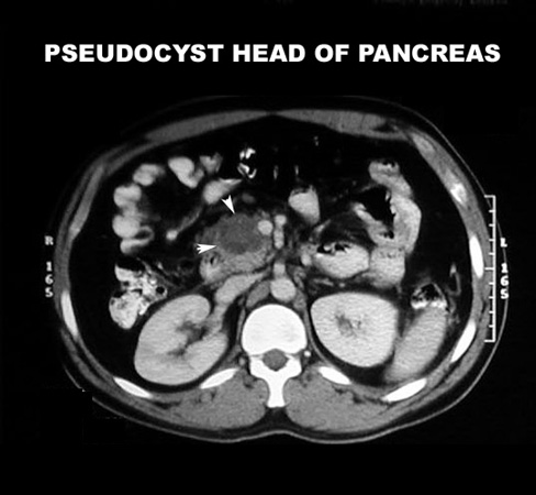 CT scan in a patient with chronic pancreatitis and pseudocyst. |
