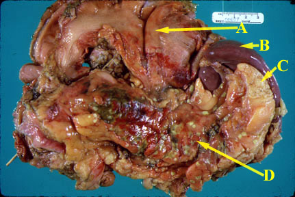 An autopsy specimen consisting of the stomach (A), spleen (B), pancreas (D), and adjacent fat (C) reveals acute inflammation. The pancreas is swollen and hyperemic. Focal areas of green necrosis are present. Small foci of bright yellow, fat necrosis are present. The stomach is folded back so as to reveal its posterior wall and the pancreas. |