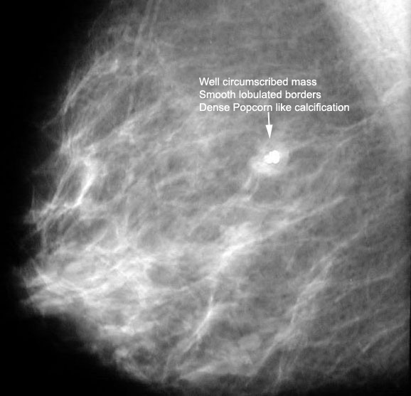 - It may have the appearance of a dense, popcorn-like calcification on mammogram.